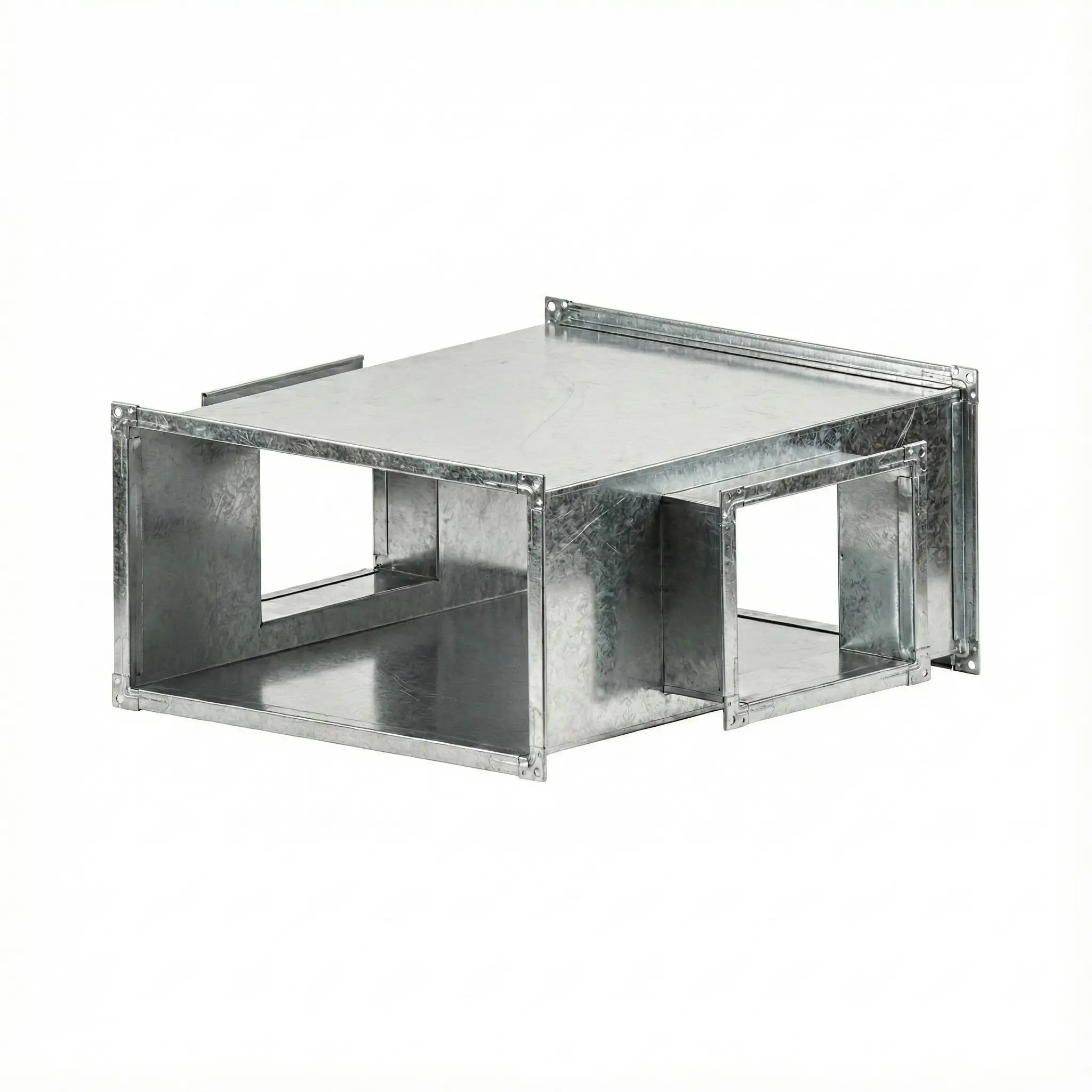 Крестовина прямоугольного сечения предназначена для организации пересечения и разветвления вентиляционных магистралей в системах общеобменной вентиляции и кондиционирования. Изделие применяется в узлах, где требуется соединить два взаимно пересекающихся направления воздуховодов.